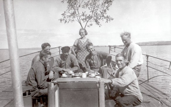 Fr.v på sotskåp och oljetankar; Henry Eriksson fr Västanvik, Olle Bröms, Gunnar Anbo. På däcket skeppare Gunnar Dahlberg och andreskeppare Sven Carlsson. Saknas på bilden gör Valter Larsson, kockan Jakopes Märta och fotografen Clas-Göran ”Putte” Berg. Från Valter Larssons samlingar