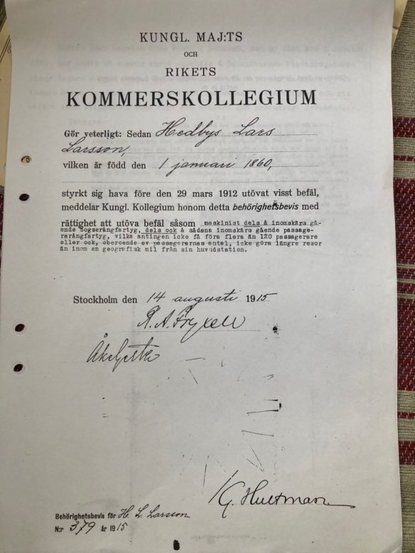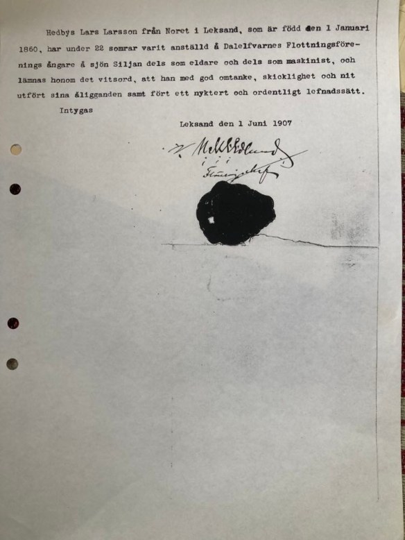 1905 och 1907 ber Hedbys Lars Larsson att få tjänstgöringsbetyg från flottningschefen Edlund på DFF resp. från disponent Haglund. Möjligen för att dessa herrar slutat sina anställningar eller så behövde Hedbys Lars papper för att styrka sin behörighet som skeppare. Själv hade han tjänsten som skeppare på NORSBRO fram till 1917.