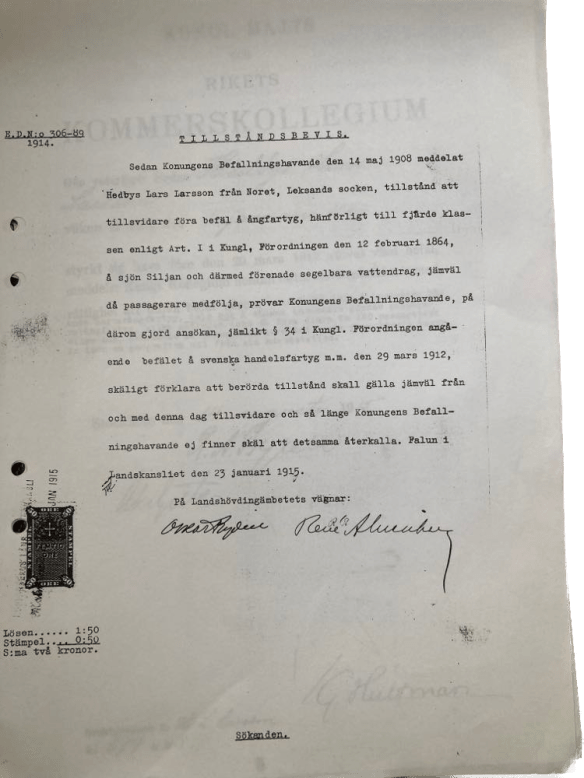 Ångbåtsföraren Hedbys L. Larsson i Noret Leksand, har under åren 1900 till och med 1904 under seglationstiden fördt Ångaren Norsbro i föreliggande arbeten med bogsering och spelning af timmer, samt bogserat och gått med trälast till Rättvik. Under ifrågavarande tid har han varit apsolut nyckter ådagalakt förmåga att föra befäl över Ångbåten, samt varsam och plikttrogen i anförtrodda uppdrag, samt utfört sitt arbete till min fulla belåtenhet vilket under nämnd på begäran betygadt.