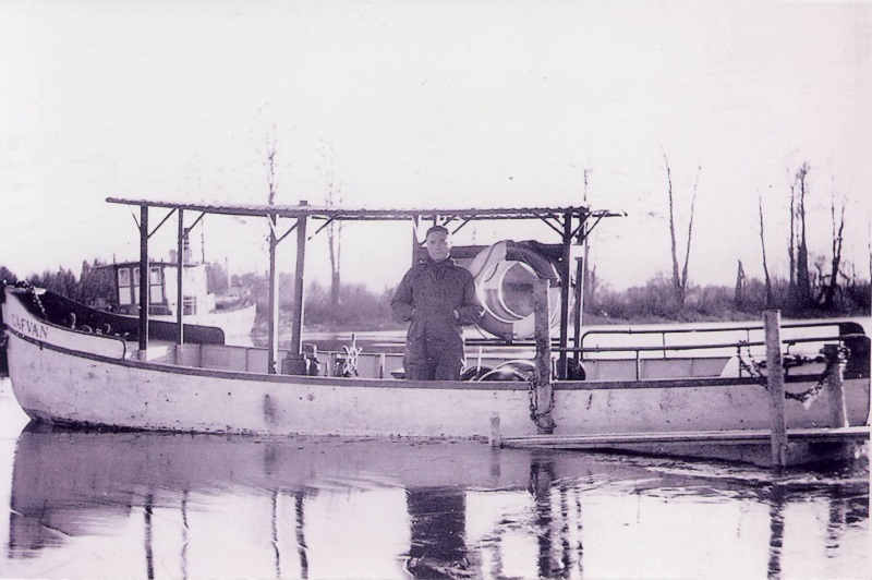 GÄFVAN under tidigt 50-tal som namnet då stavades. Fotot taget vid Svartbäcken i Nedre Dalälven Båtförare är Elon Norling i Kölna, Gysinge. I bakgrunden ses ångf. LAXEN. Foto från Pelle Söderlunds samling.